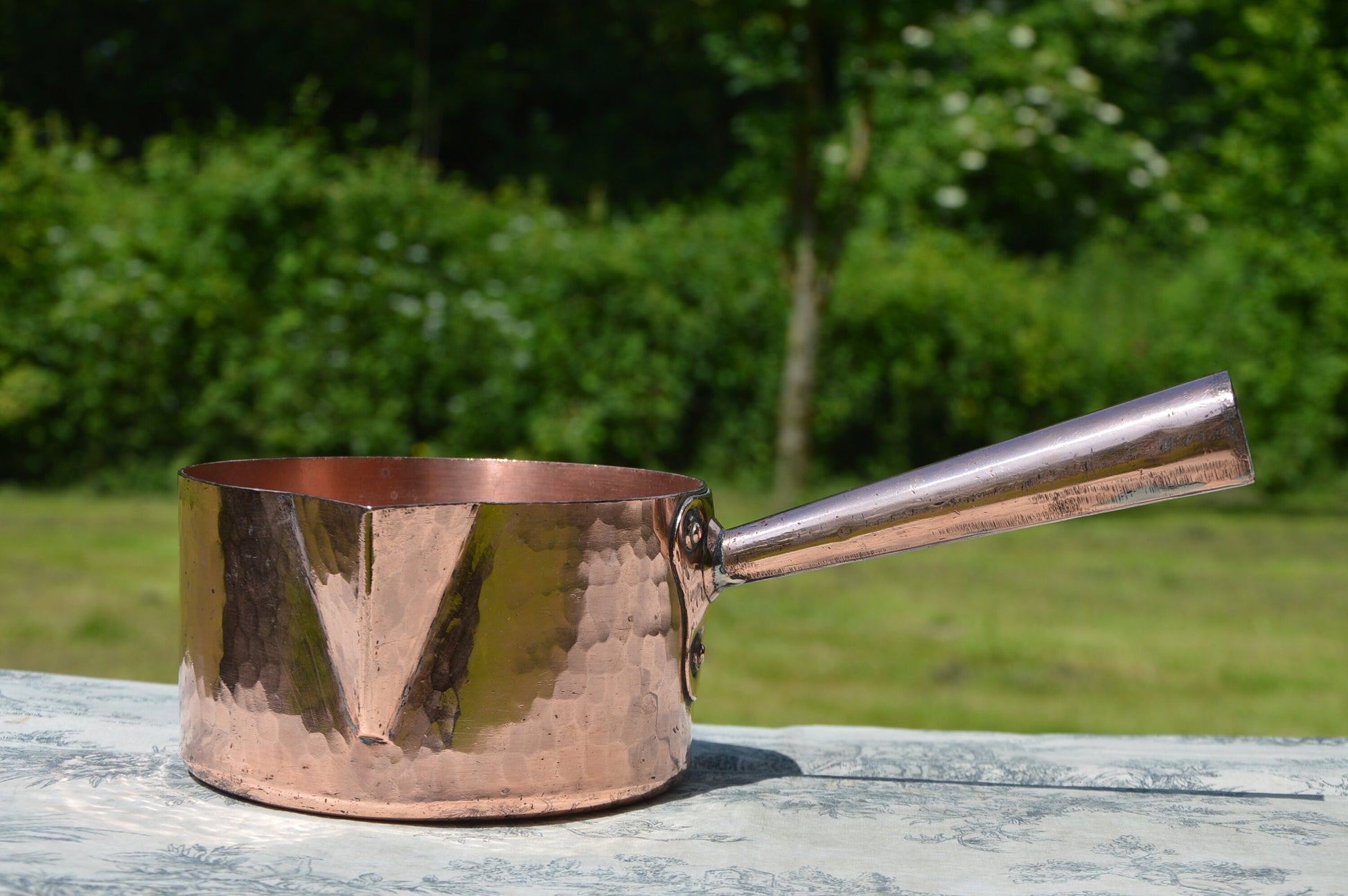 Lovely, stand alone piece This is totally hand made, the copper is hand cut, the rivets are hand made the pan has been raised and hand hammered. The spout has the traditional pout shape for easy pouring.