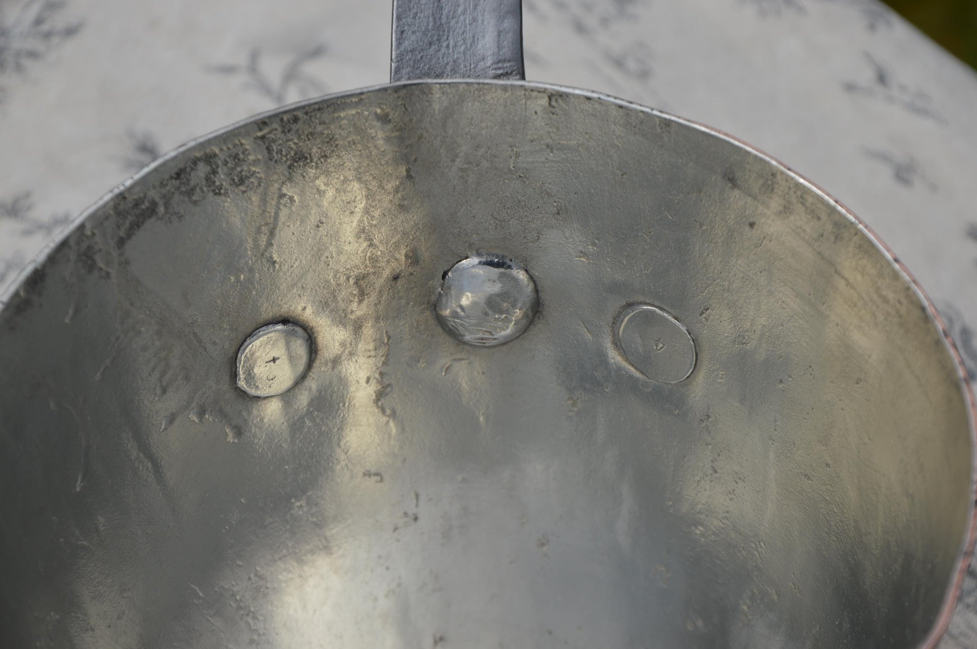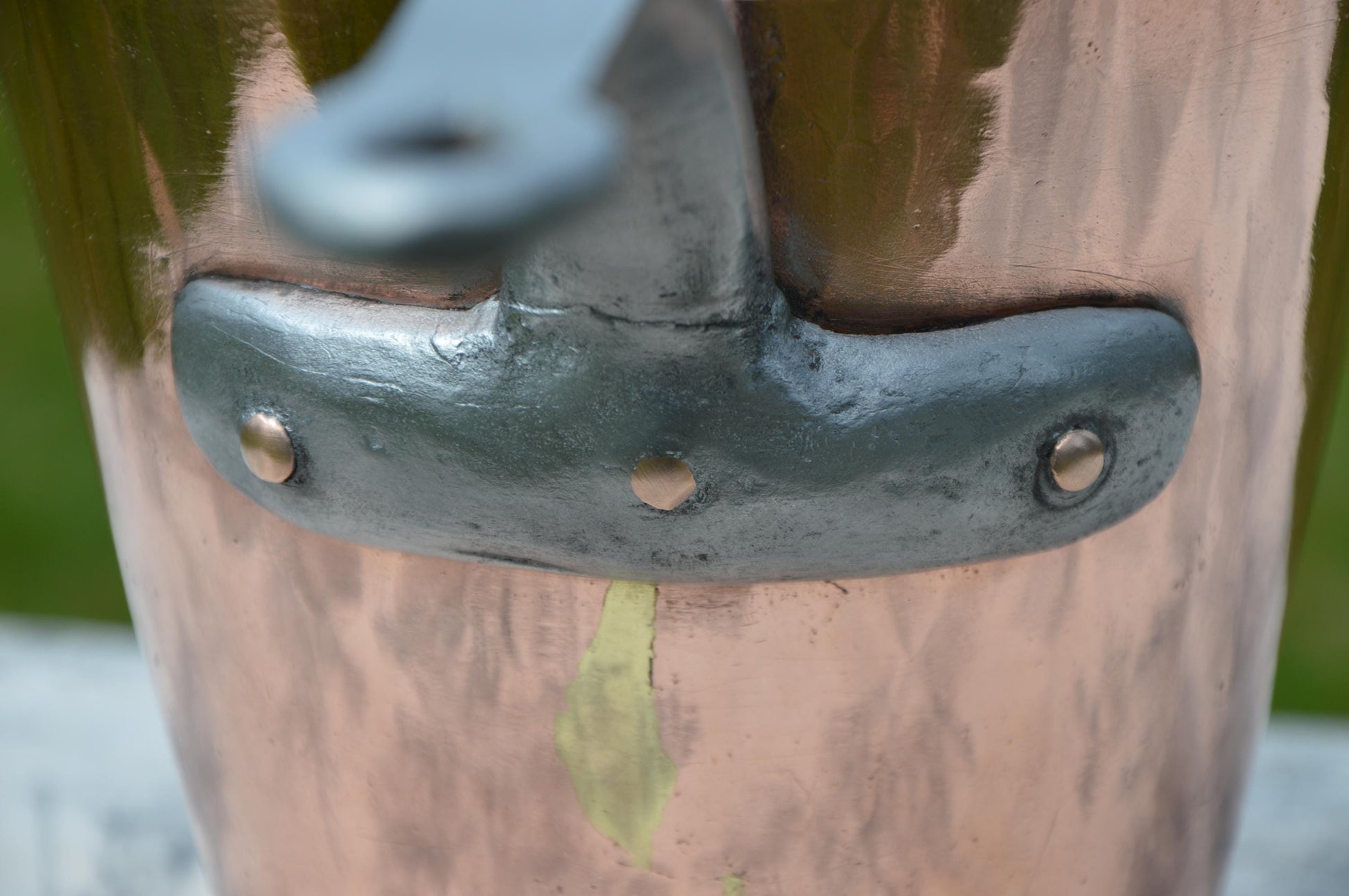 It looks amazing hanging up, the patina is unusual and absolutely exceptional. The handle is firmly and securely fixed by three massive, proud copper rivets.