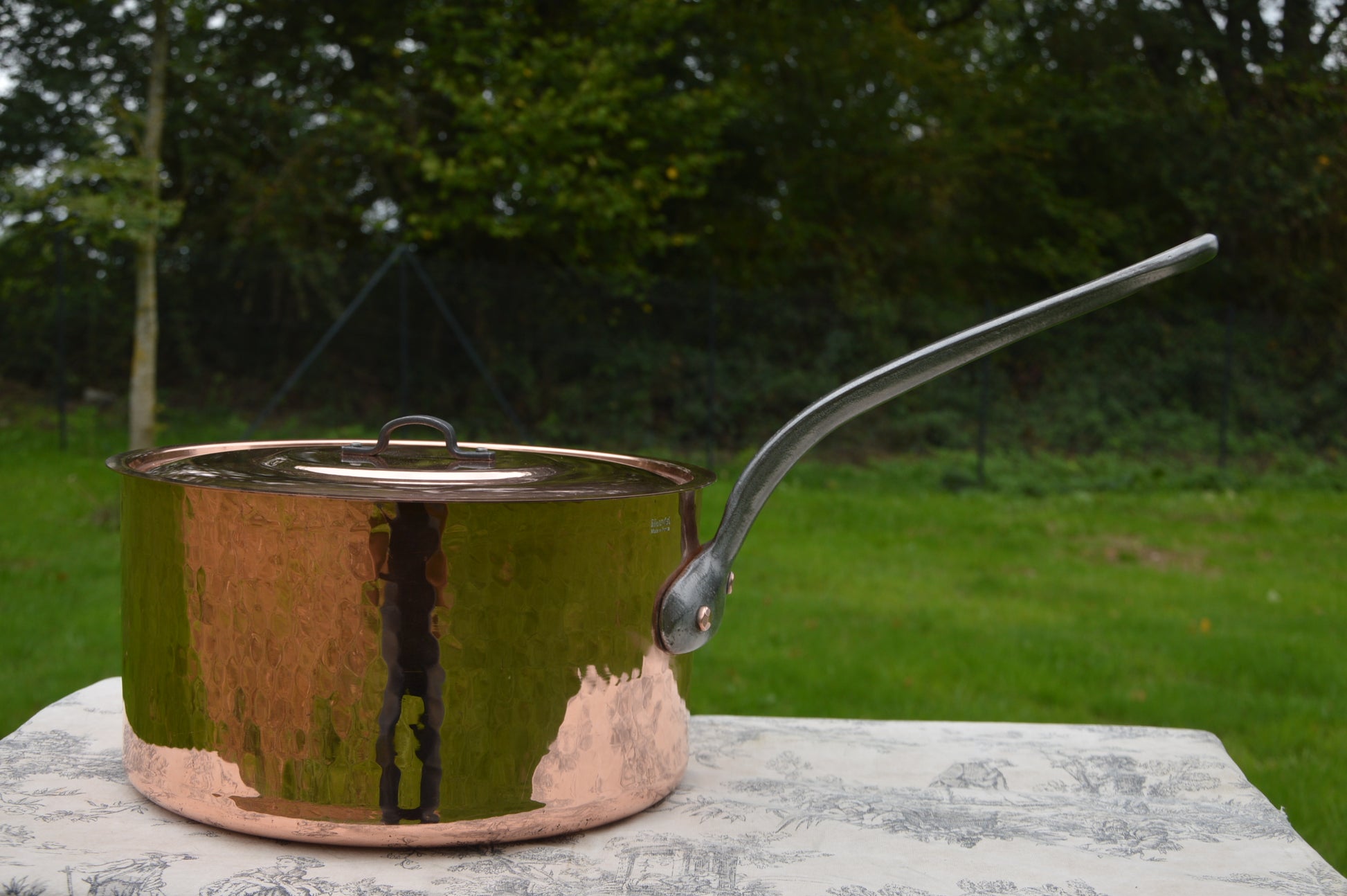 MASSIVE ANTIQUE EXCEPTIONAL BIG MAUVIEL SAUCEPAN WITH MASSIVE COPPER RIVETS, CAST IRON HANDLE 3 MM HAMMERED STAMPED MAUVIEL MADE IN FRANCE
