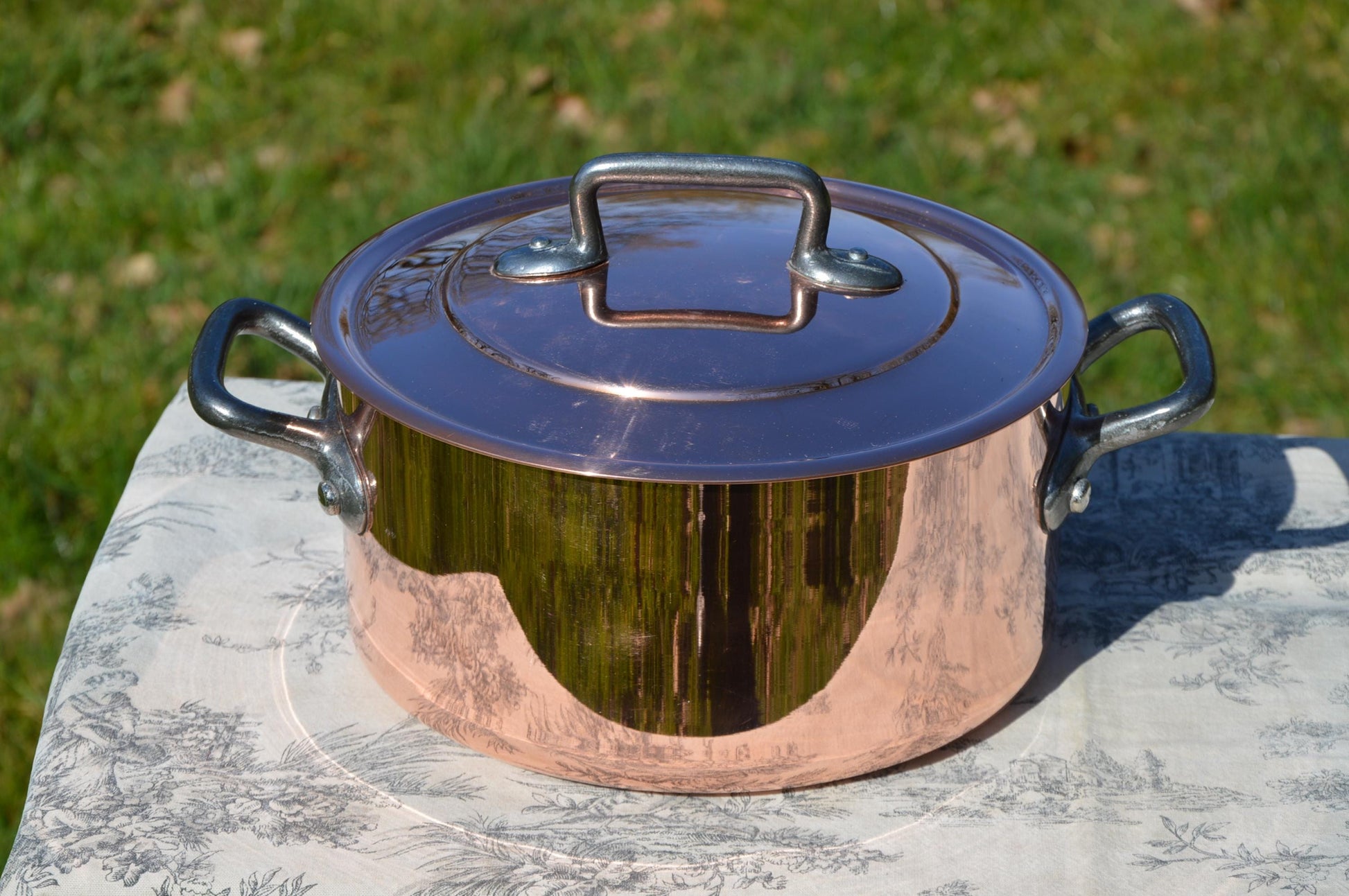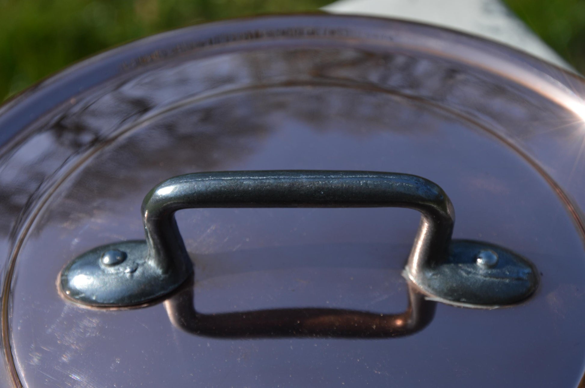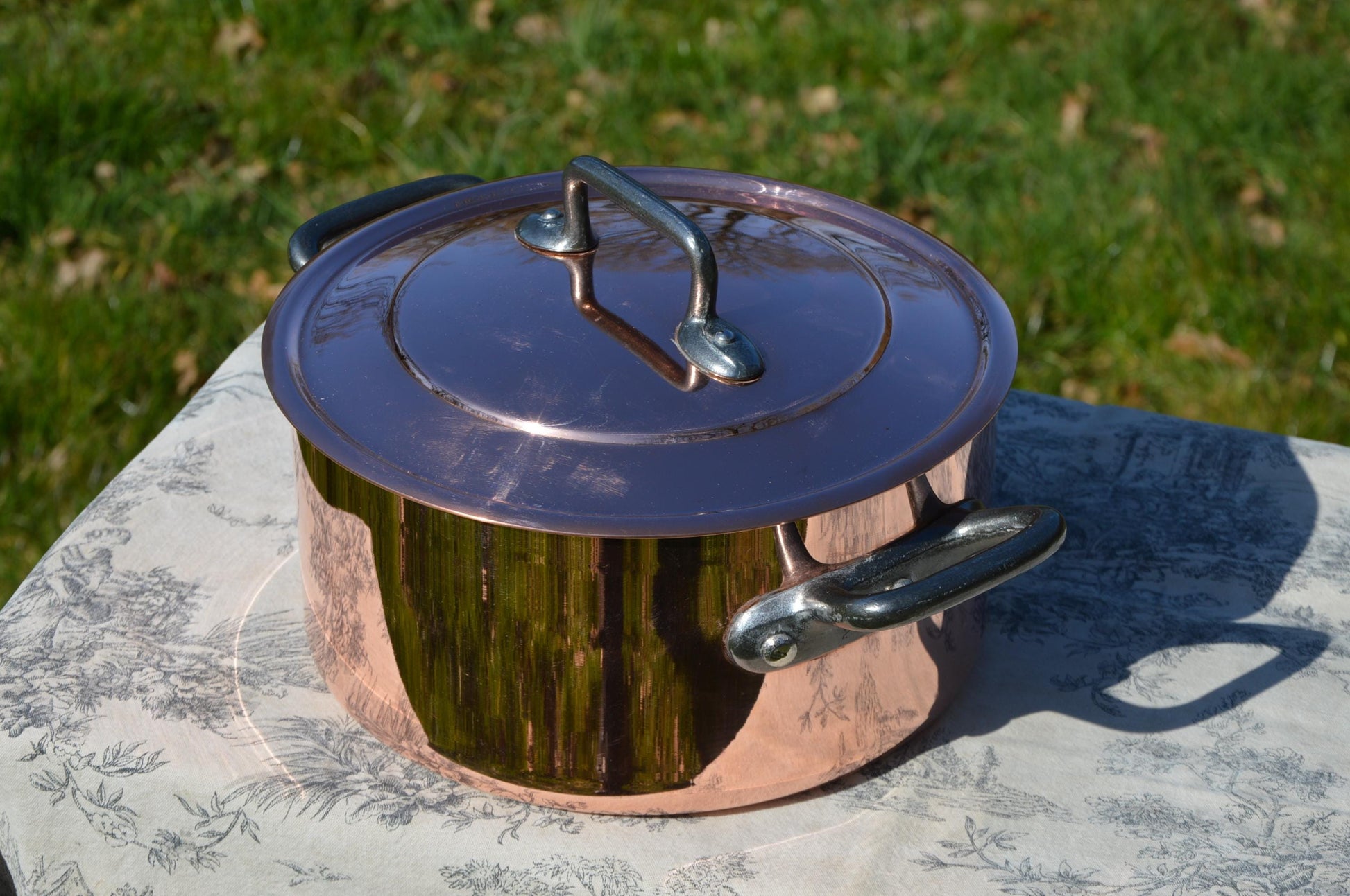 This is all solid copper - the handles are iron - real old-fashioned quality. This is a usable vintage pot, it has had a long productive life and is now refurbished to have another.