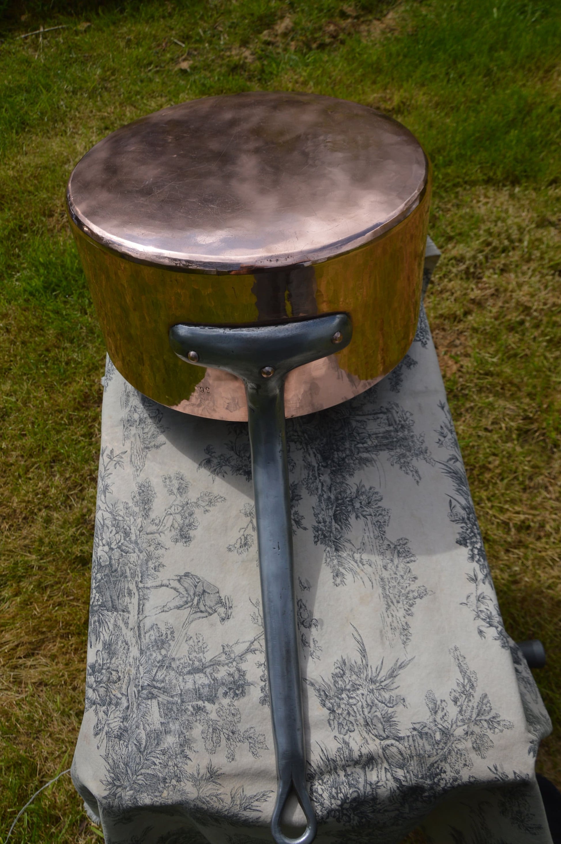 Vintage French Copper Saucepan: 36cm Re-Tinned Pot with Cast Iron Handle