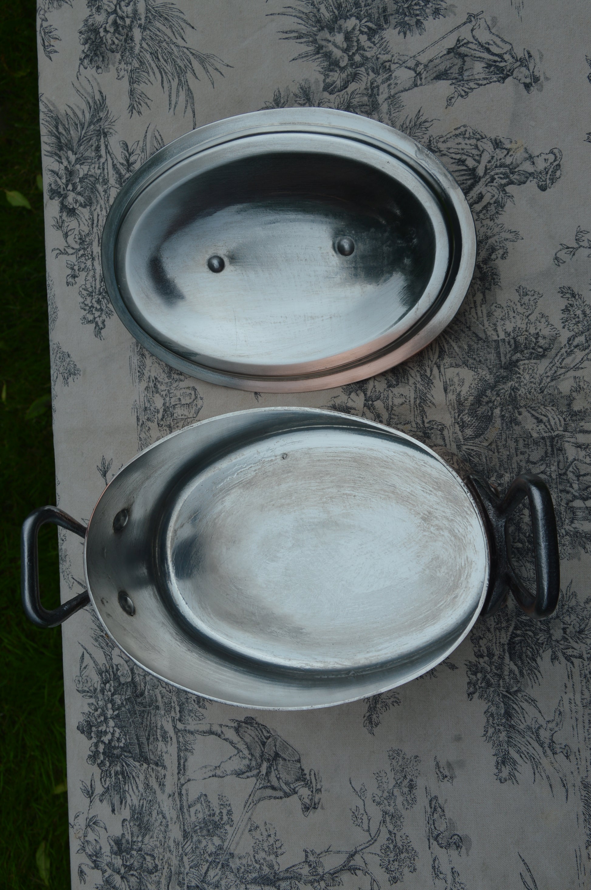 We refurbish all our pans and kitchen accessories. They are polished, they are cleaned thoroughly, the handles are checked, the interiors are checked for completeness - we renovate old tin and re-tin as necessary. You are getting a good vintage pan in a nearly new condition that can be used immediately - or an antique pan that is ready for another session in your kitchen.
