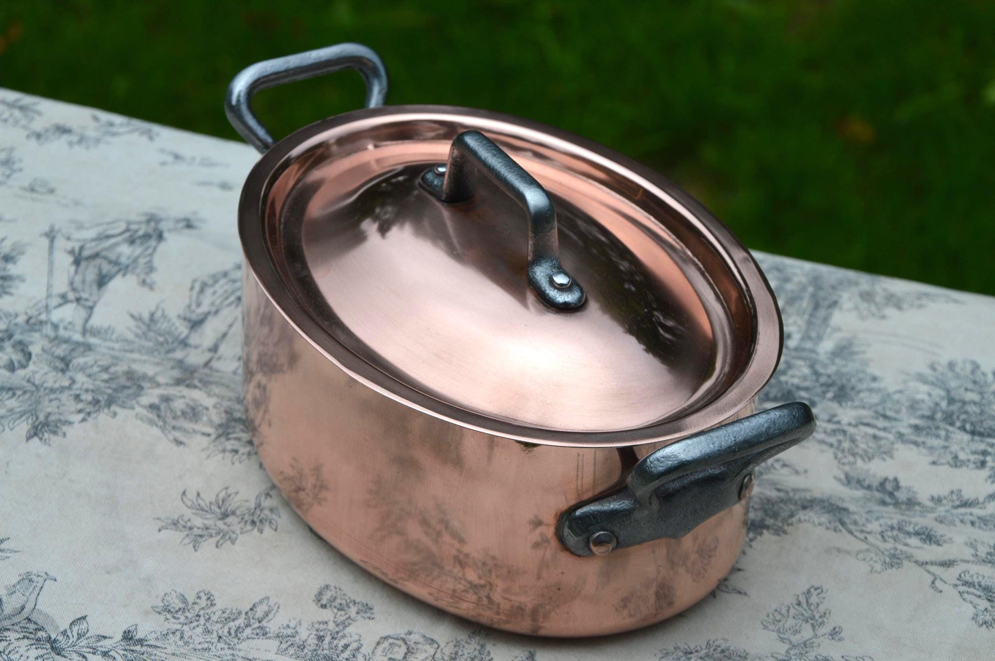 Antique Copper Casserole: French Oval Pot with Cast Iron Handles