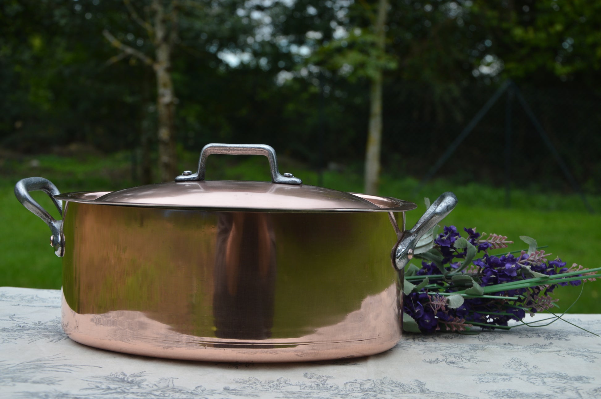 This is a rare find, this is a superb piece of French kitchen kit - a real professional super looker that will sit on your hob or your oven like it was meant to be. It has a new tin lining and cast iron handles this beautiful thing is sturdy and lovely to look at. There are signs of use and wear.