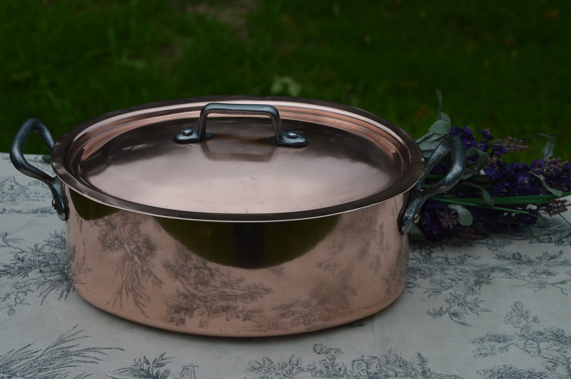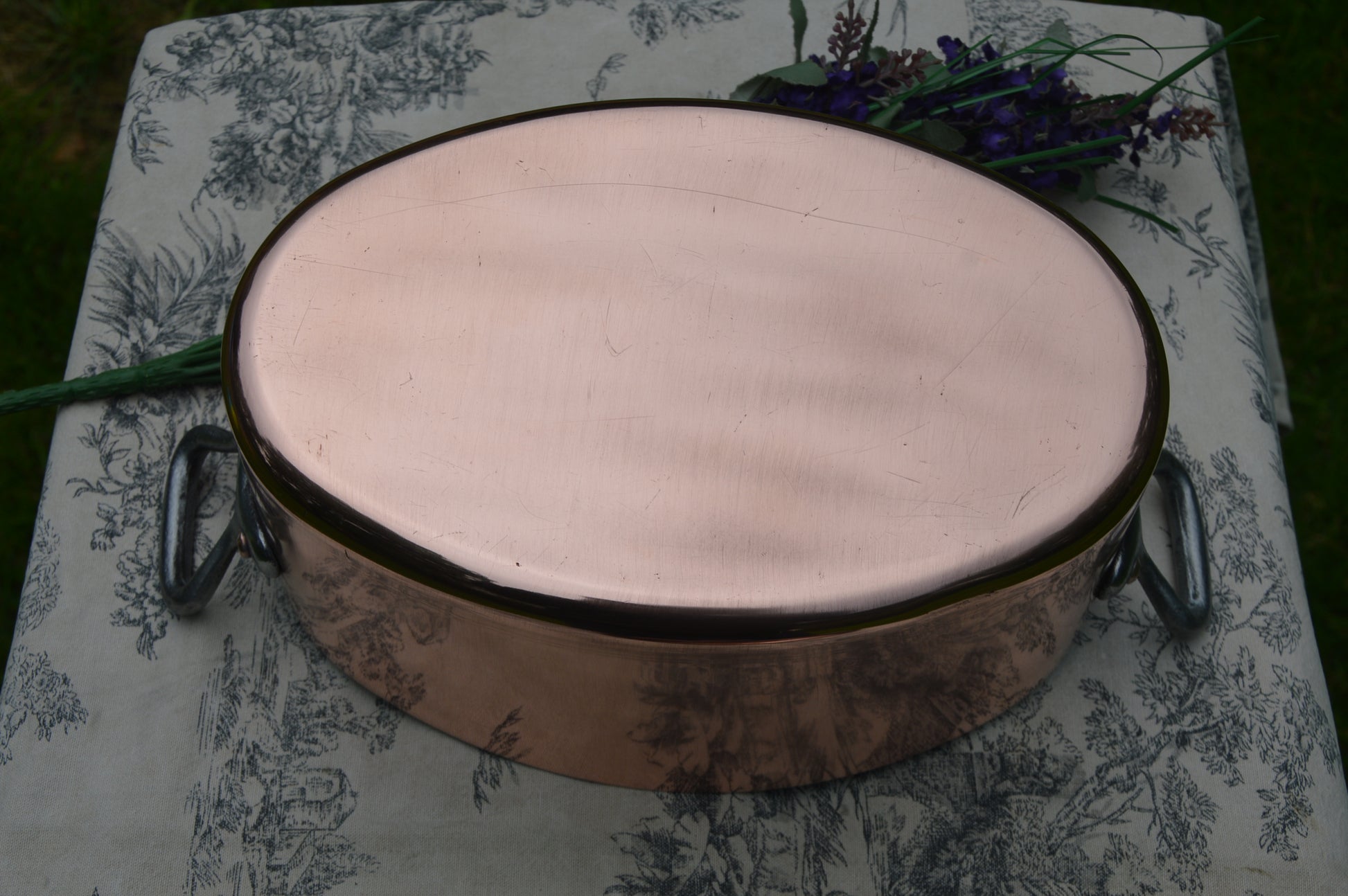 Antique Copper Casserole: French Oval Pot with Cast Iron Handles 24cm