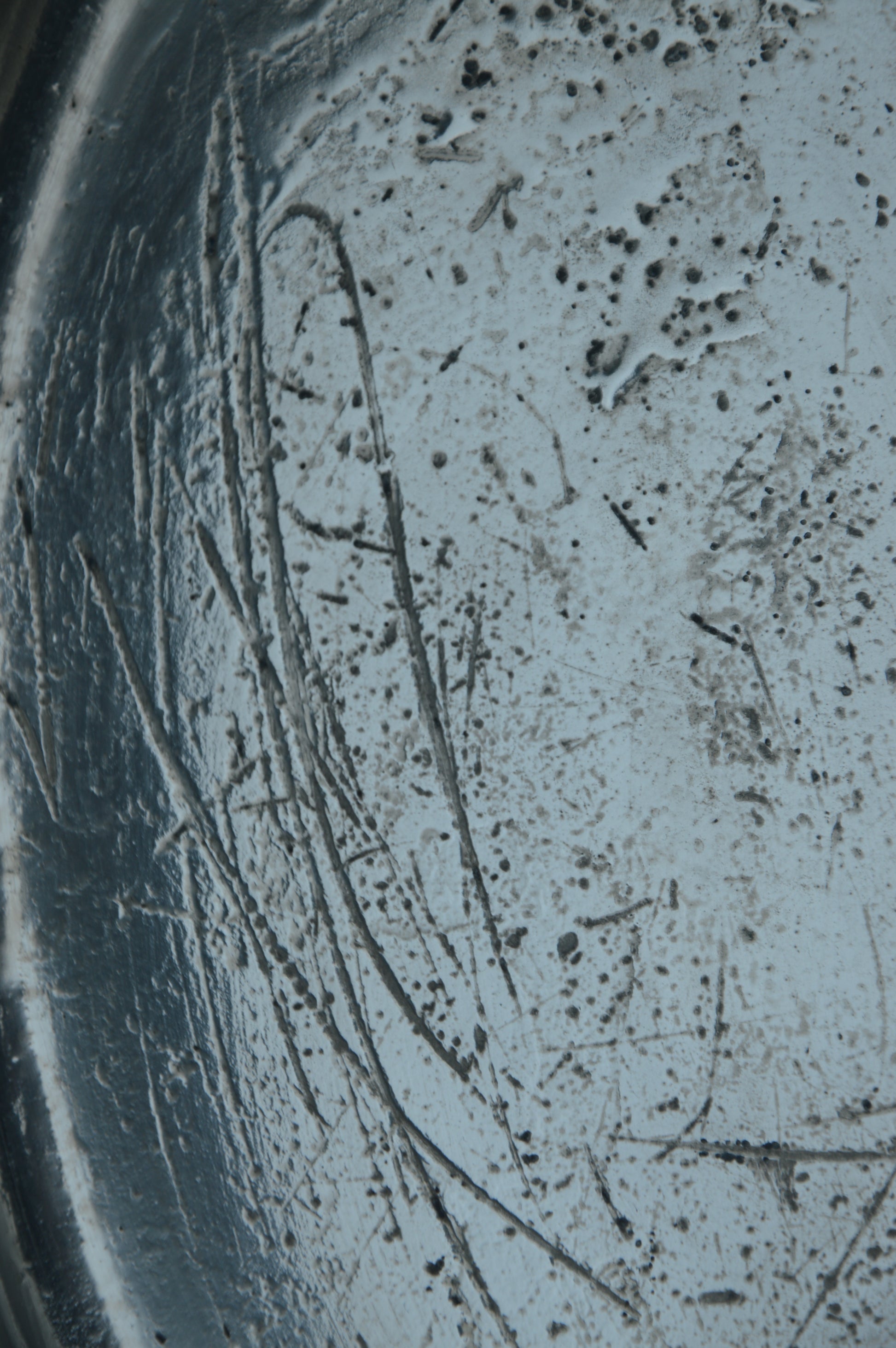This has some interior issues. There are considerable scratches on the base from heavy use in a commercial kitchen, the new hand wiped tin has been applied thickly over this area.