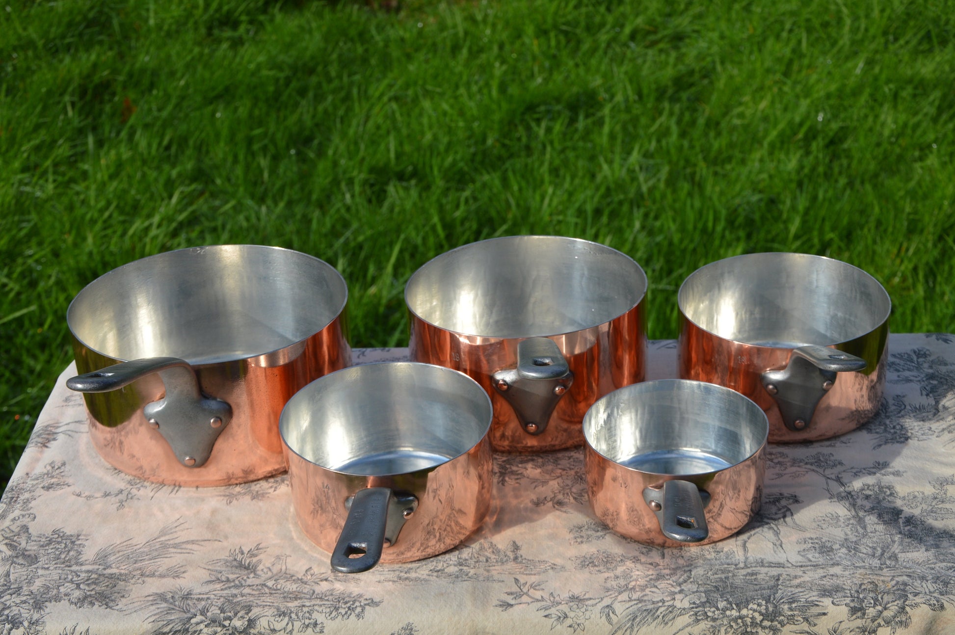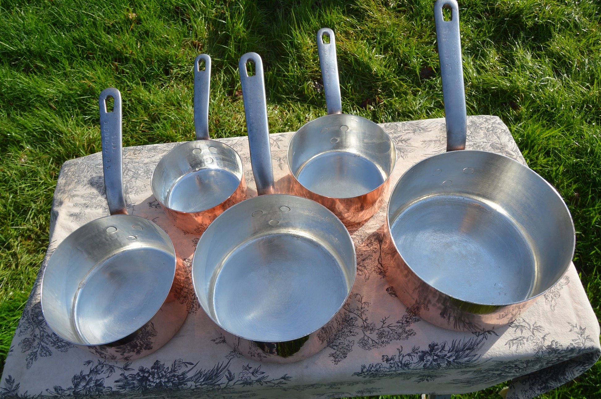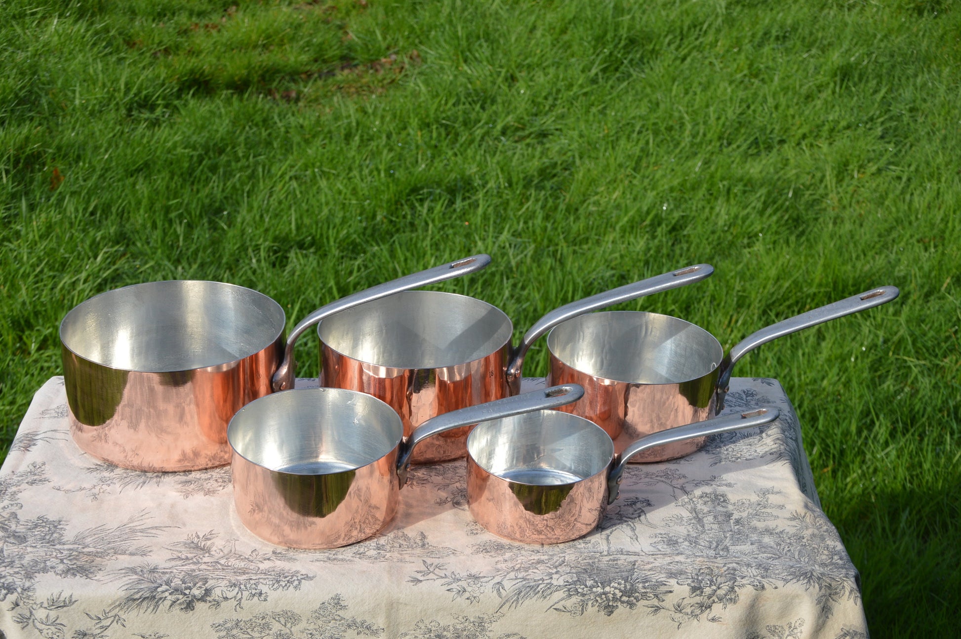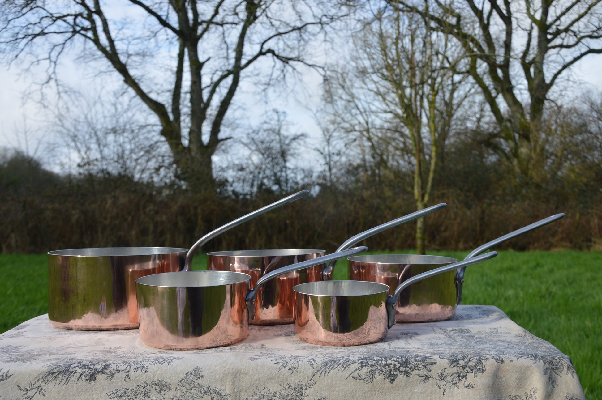 Antique French Copper Saucepan Set: Hand Raised, Tin Lined, Iron Handle