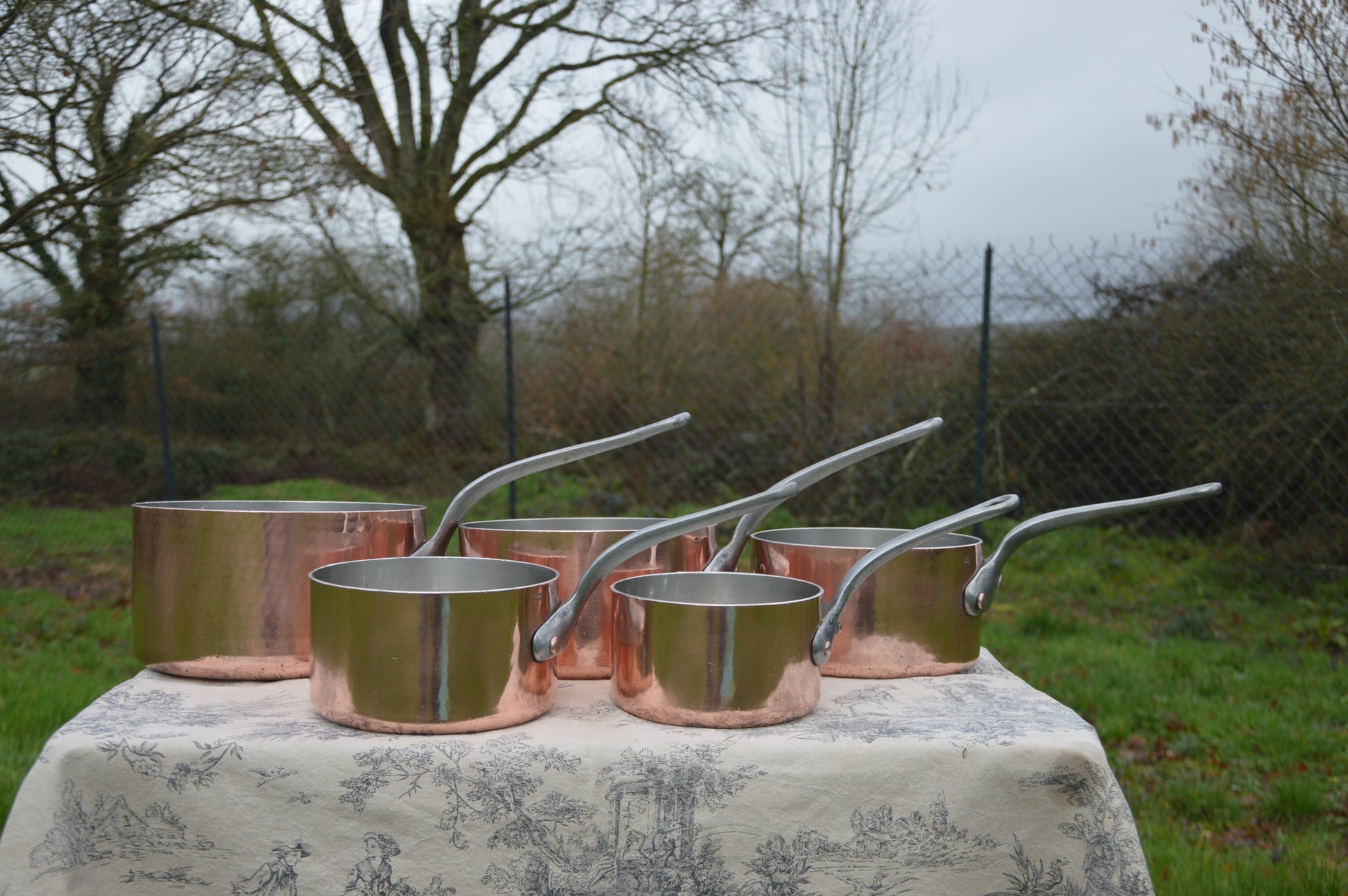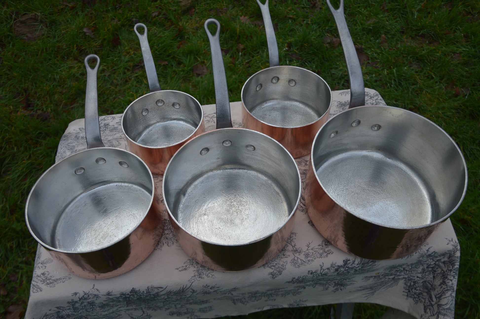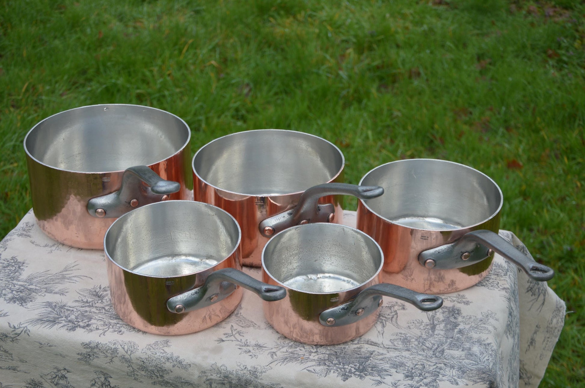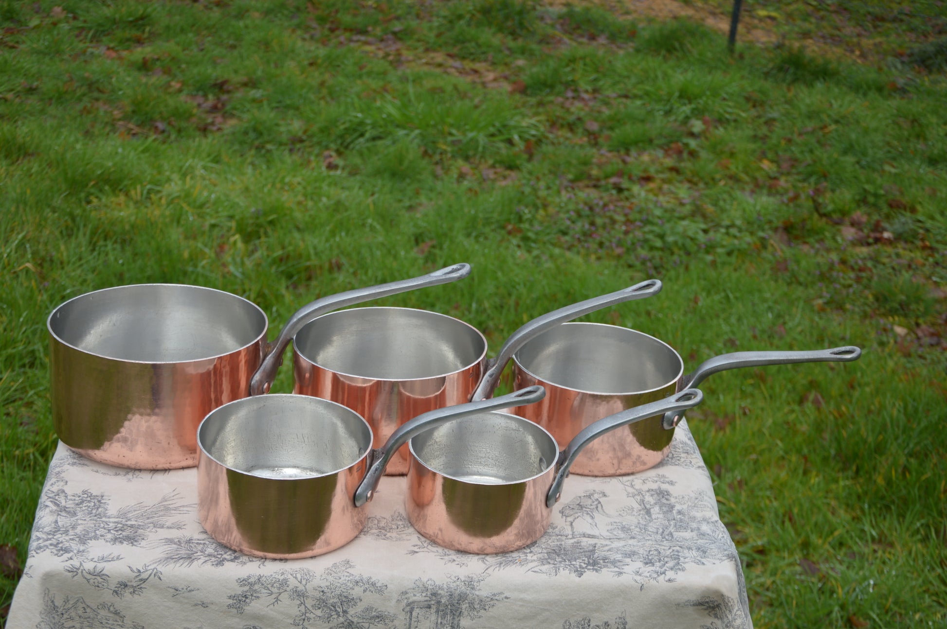 Copper Pans 2.6-2.8mm Copper Vintage French Professional Graduated Pans Set of Five Cast Iron Handles Tin lined Interiors Lightly Hammered