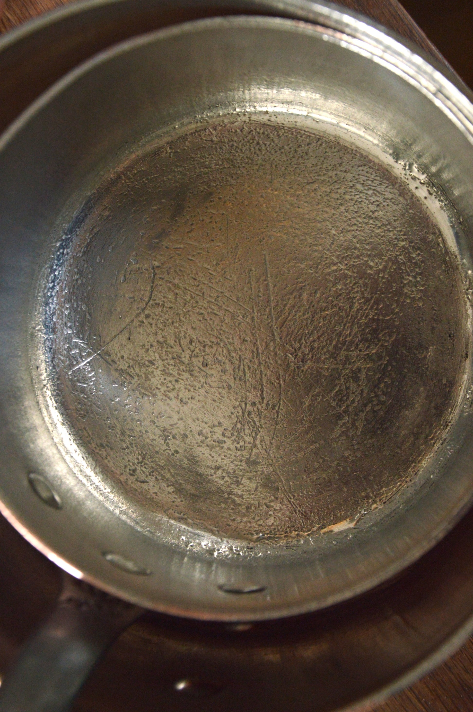 These pans have had a hard time in a professional kitchen, there are dings on the edges, pitting in the bases due to utensils, the tin has covered well, there are scratches on the outside.