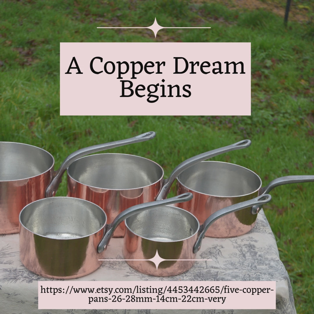 Vintage Five Copper Pans 2.6-2.8mm 14cm-22cm Very Well Used French Professional Graduated Made in France Iron Handles New Hand Wiped Tin