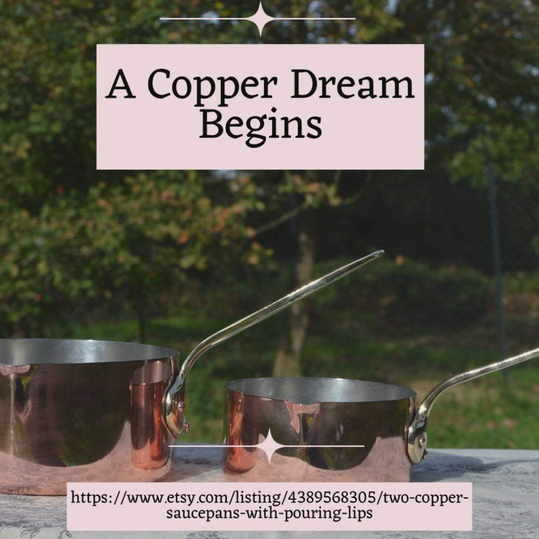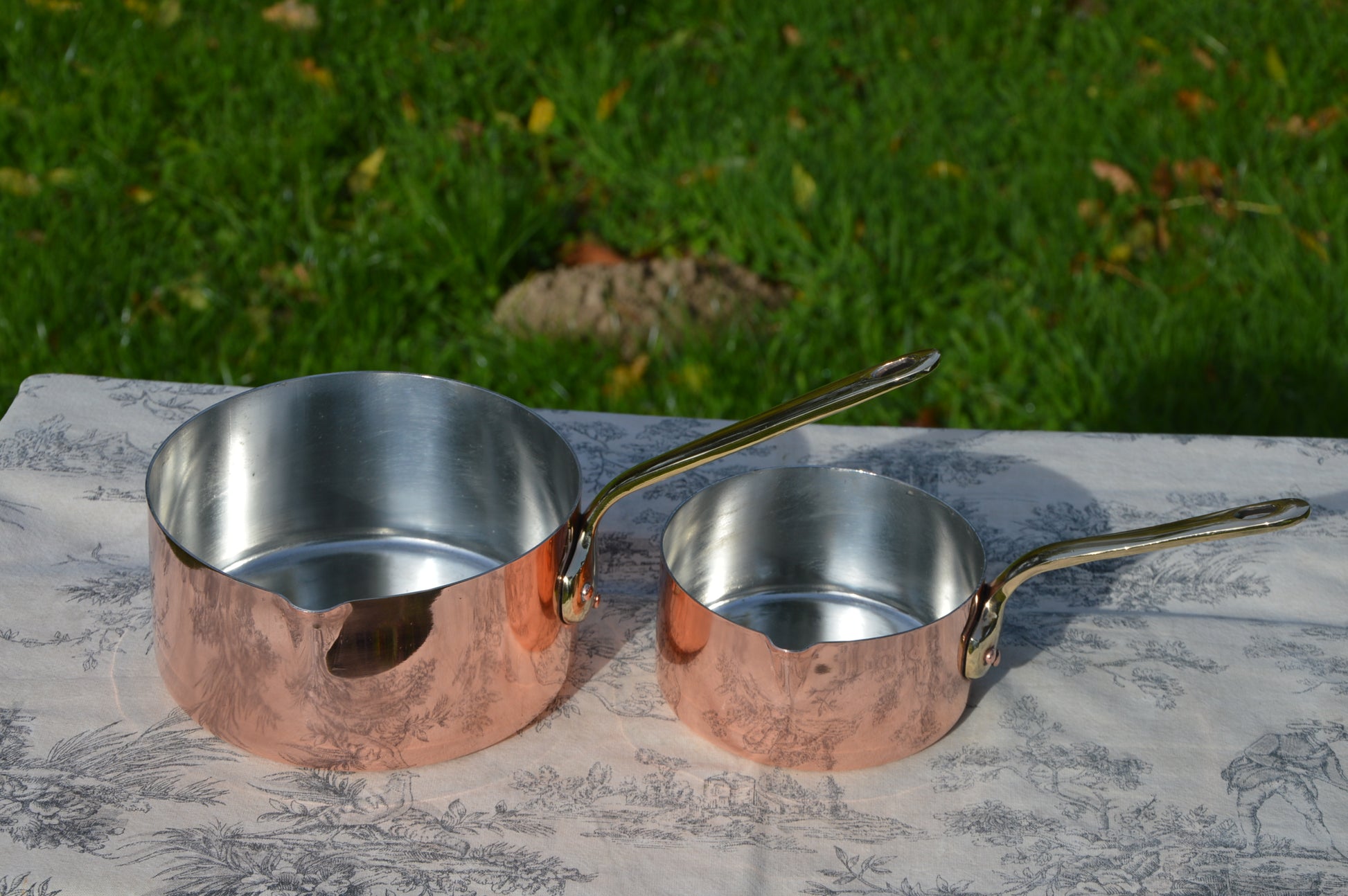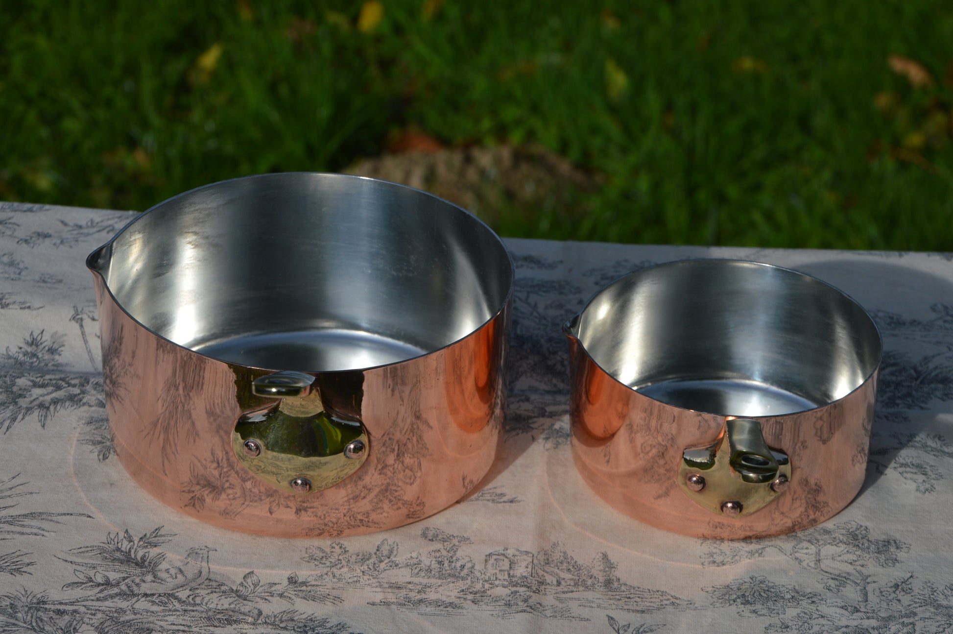 This pair is the absolute pinnacle of copper manufacture from Villedieu les Poeles, made for the professional kitchen, thankfully they will sit nicely on a domestic hob too.