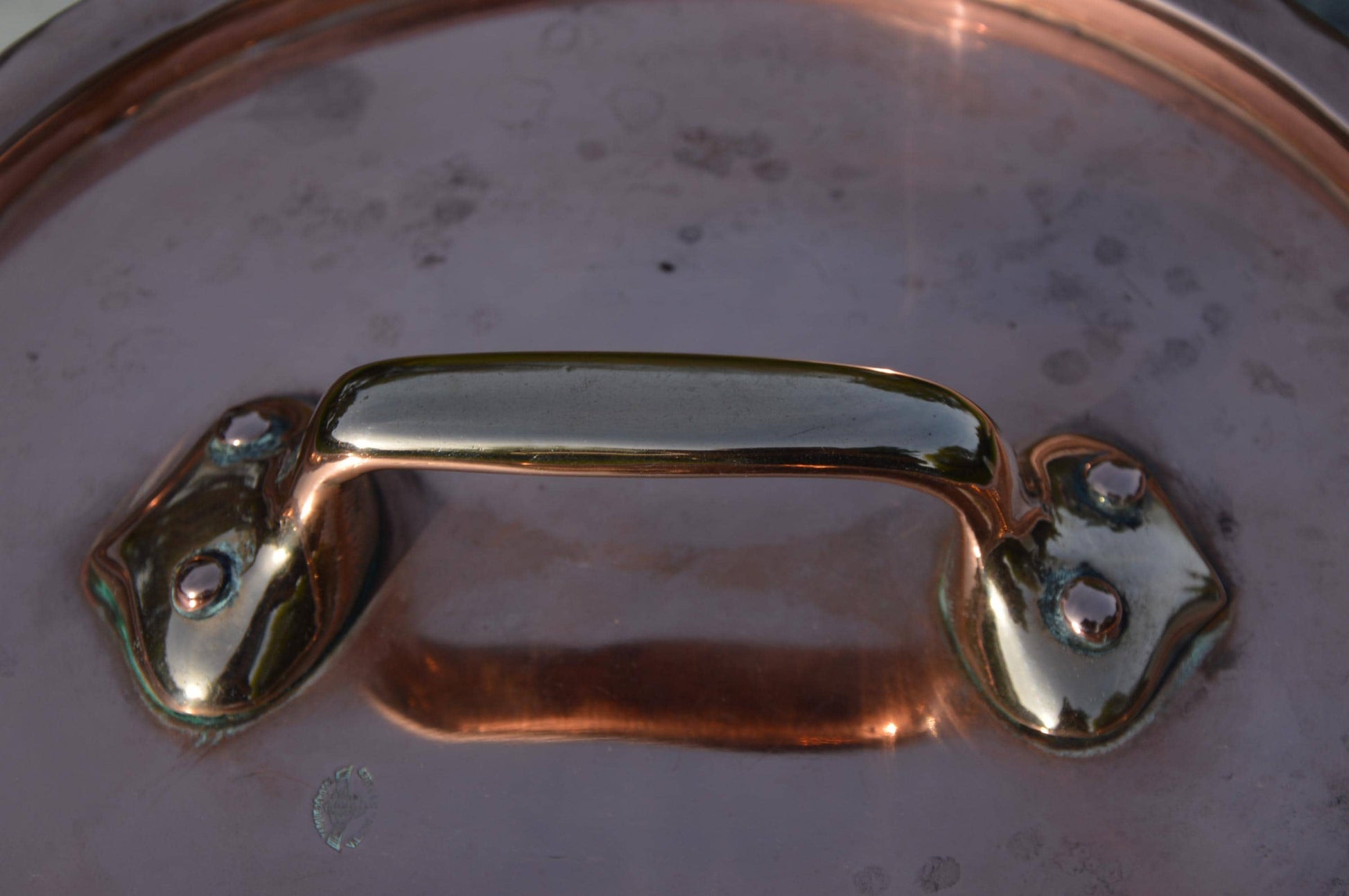 This antique saucepan has been totally refurbished by us at Normandy Kitchen, it has a new tin lining and a brand new shine. The lid has a slightly wavy edge, there are losses on the lid, there are surface scratches and signs of use an wear. This is a chunky, quality copper piece.