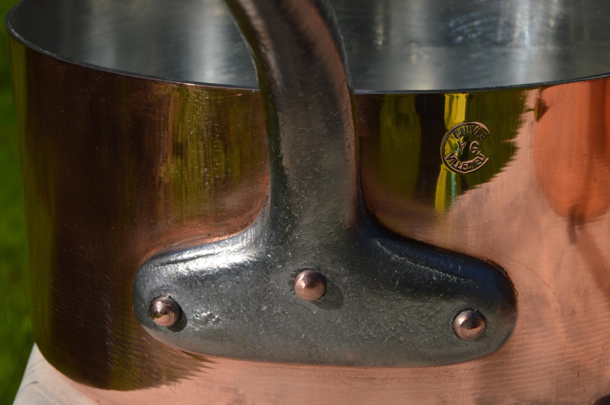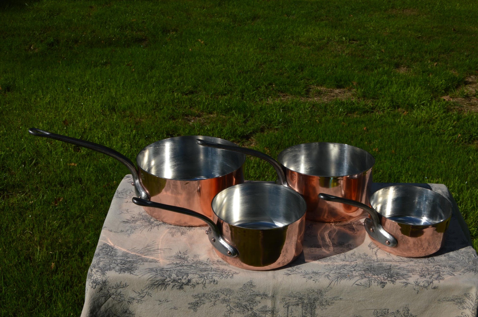 You are getting a magnificent set of pans here. Made in Villedieu les Poeles, Normandy the home of French Copper, marked Y G of Villedieu - Yves Gaultier a prestigious retailer in Villedieu les Poeles.